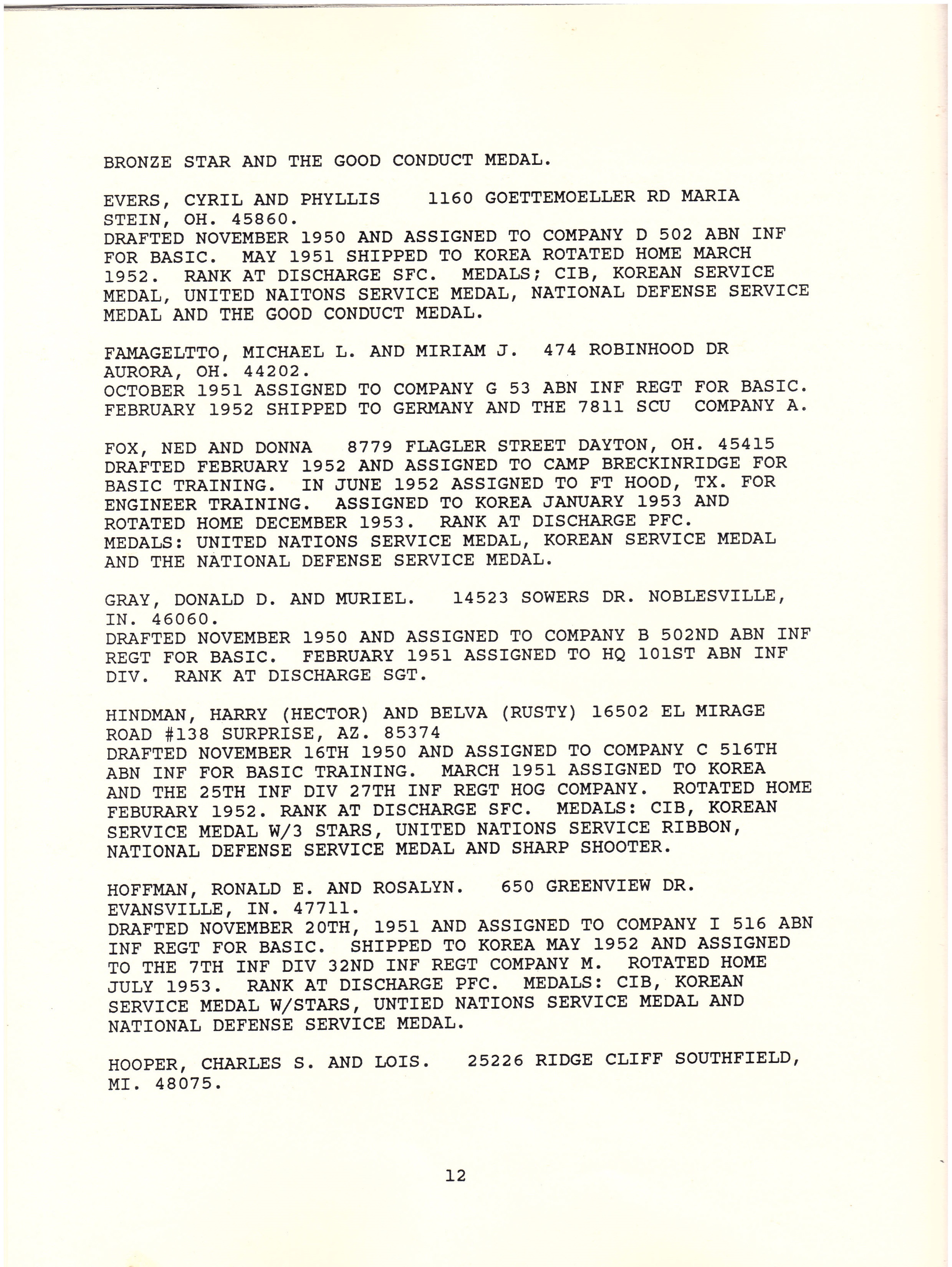 13)-Cyril Evers D Co 502nd, Michael L. Famageltto G Co 53rd, Ned Fox, Donald D. Gray B Co 502nd, Harry H. Hindman C Co 516th, Ronald E. Hoffman I Co 516th, Charles S. Hooper A Co 515th.