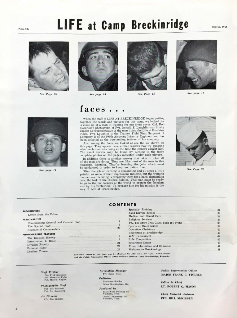 Page 2: Pfc Fred Grossman, Pfc Margaret Fulker, Pvt. Marvin Kaplan, Pfc Jim Quinlan, Pfc Ernie Svab, Maj. Frank G. Fischer, Lt. Robert G. Mason, Pfc Bill McKibben