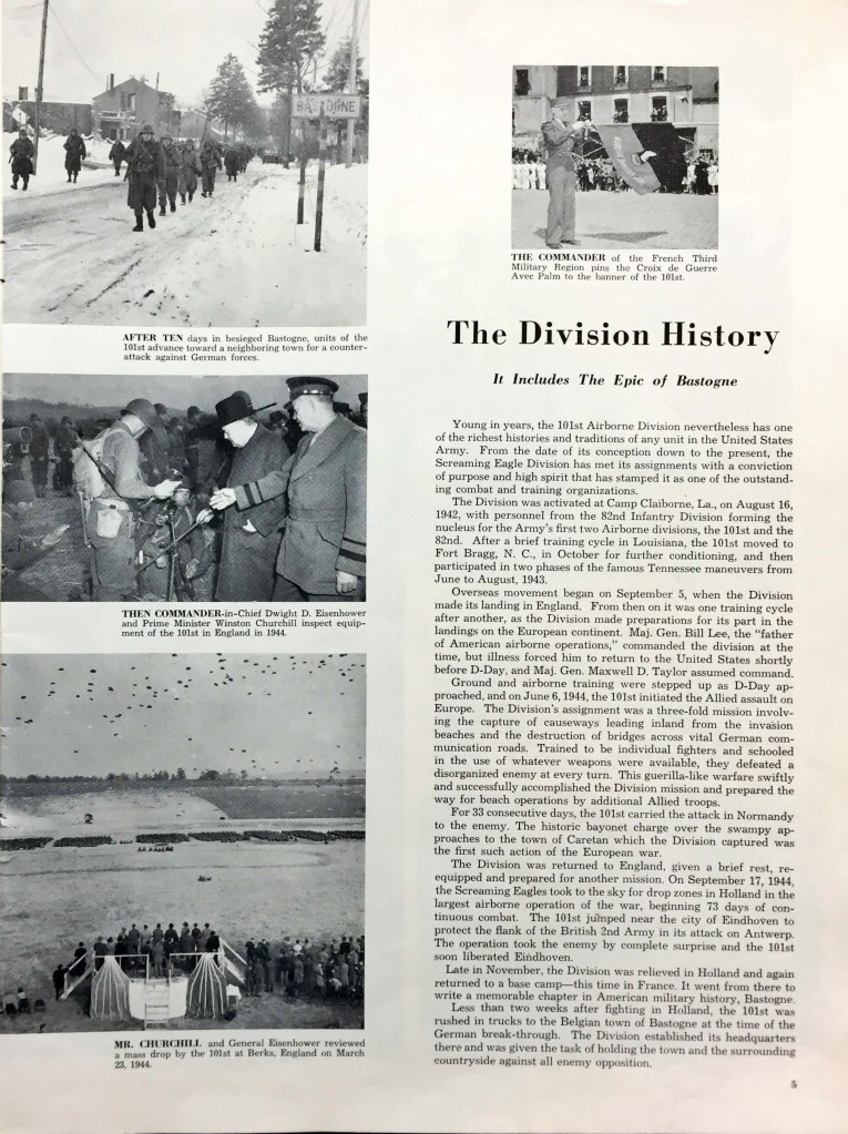Page 7: BG Anthony C. MacAuliffe, Dwight D. Eisenhower, Lt. Col. Robert G. Cole, Pfc Joseph E. Nann, MG William R. Schmidt, MG C.E. Ryan, MG Ray E. Porter